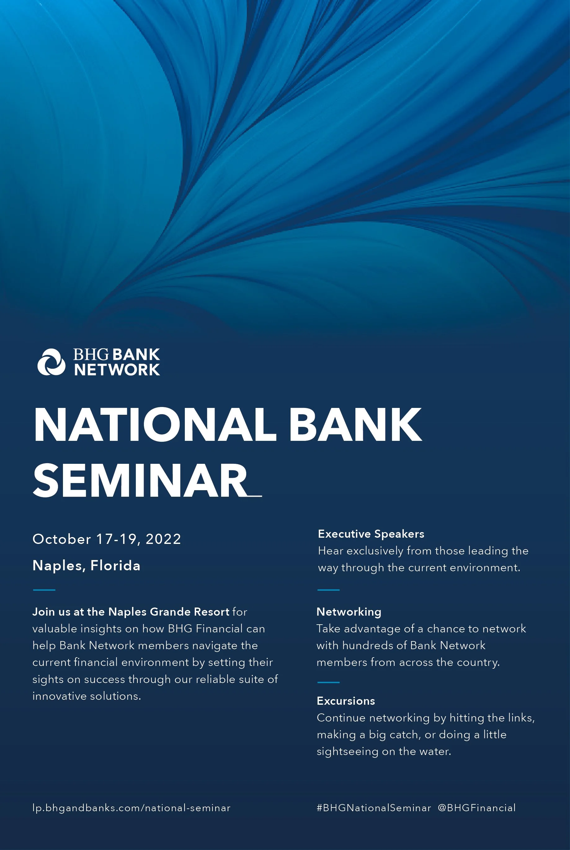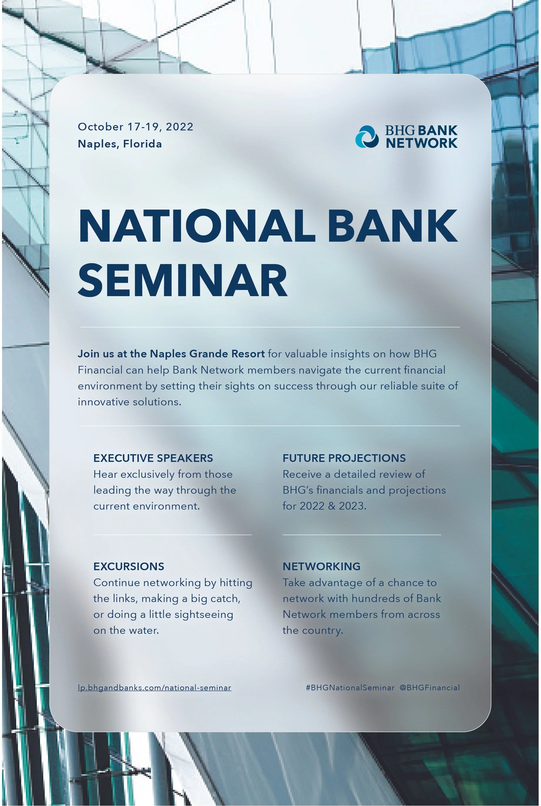 THE BHG FINANCIAL NETWORK OFFERS A FULL SUITE OF FINANCIAL PROGRAMS EXCLUSIVE TO NETWORK MEMBERS AND HOSTS ANNUAL BANK SEMINARS.