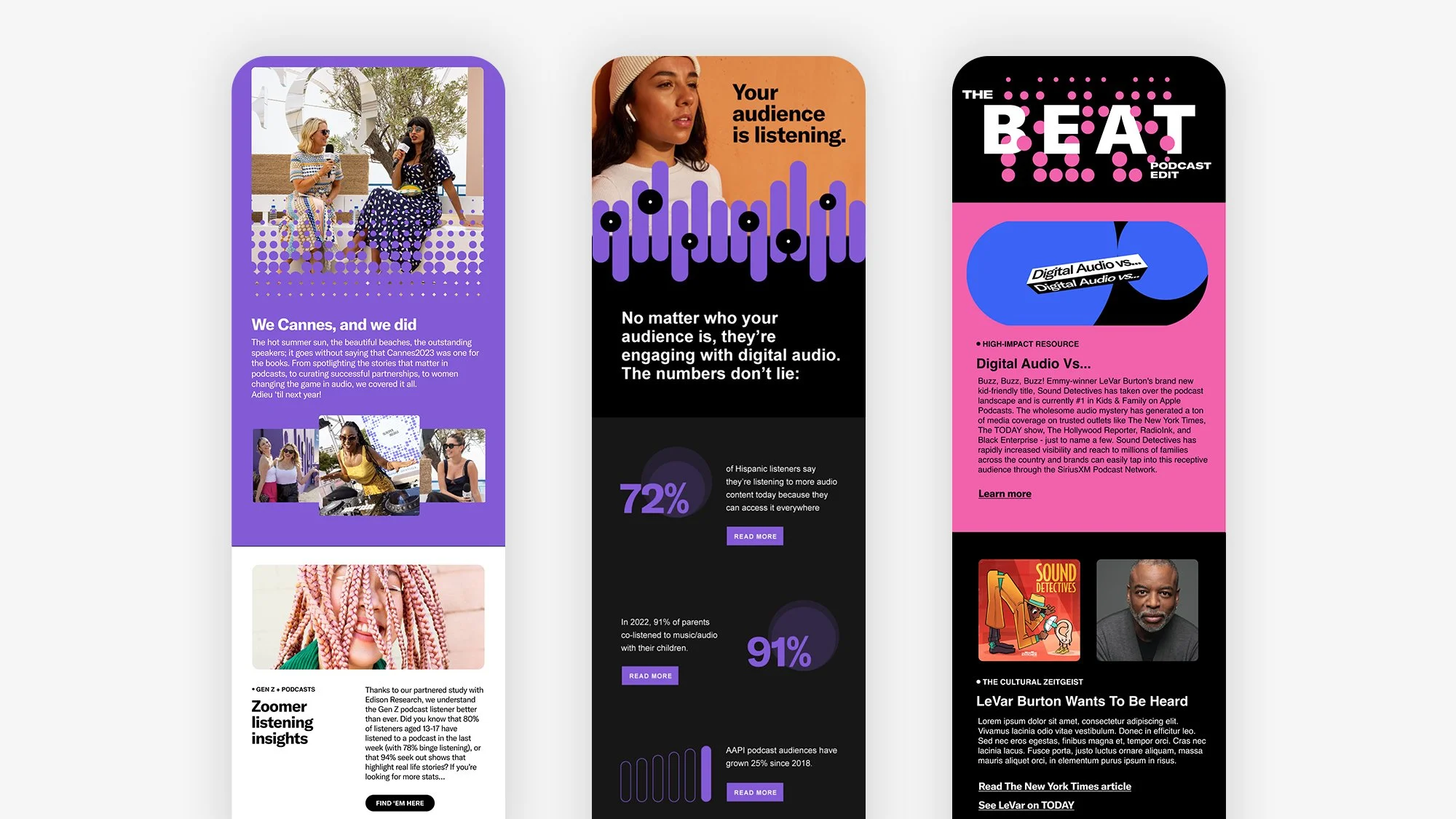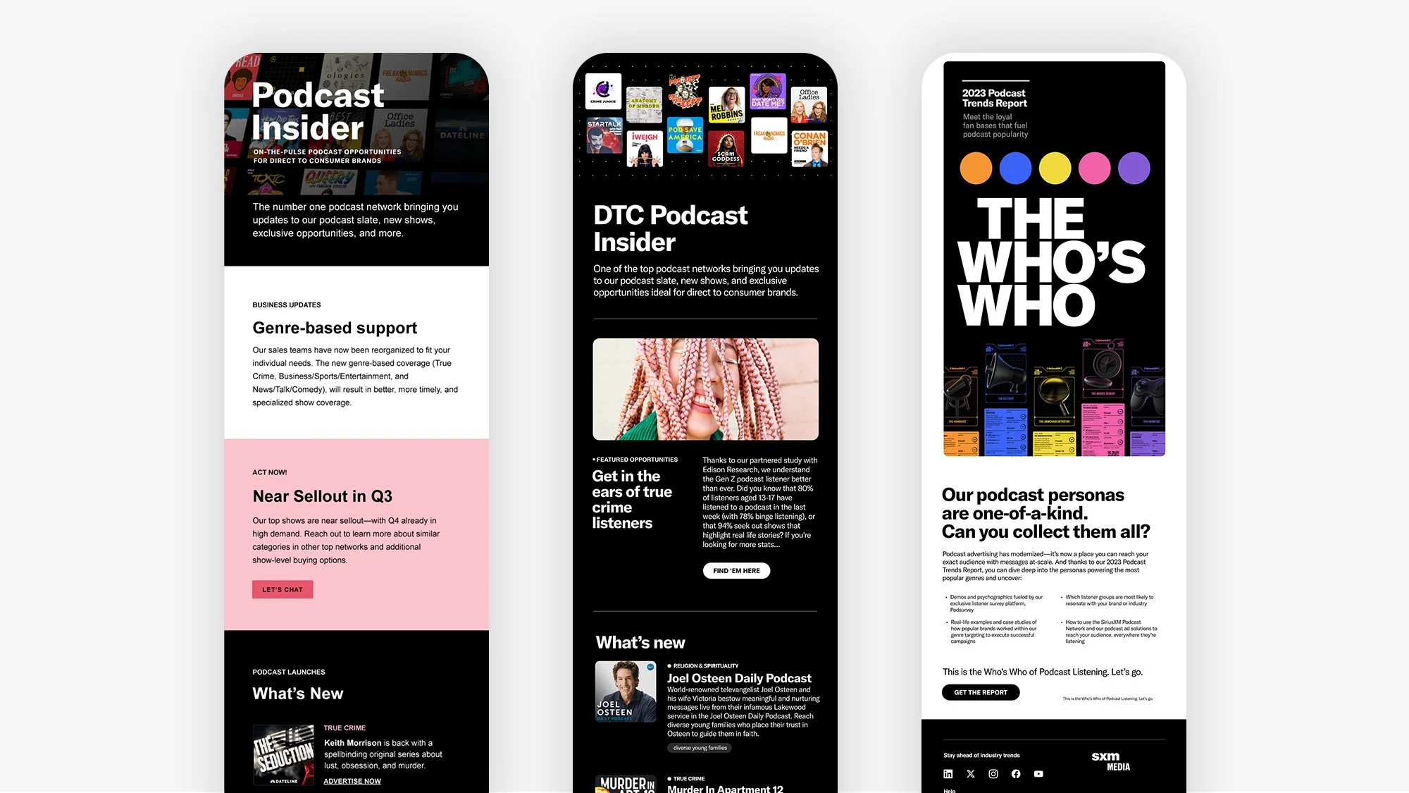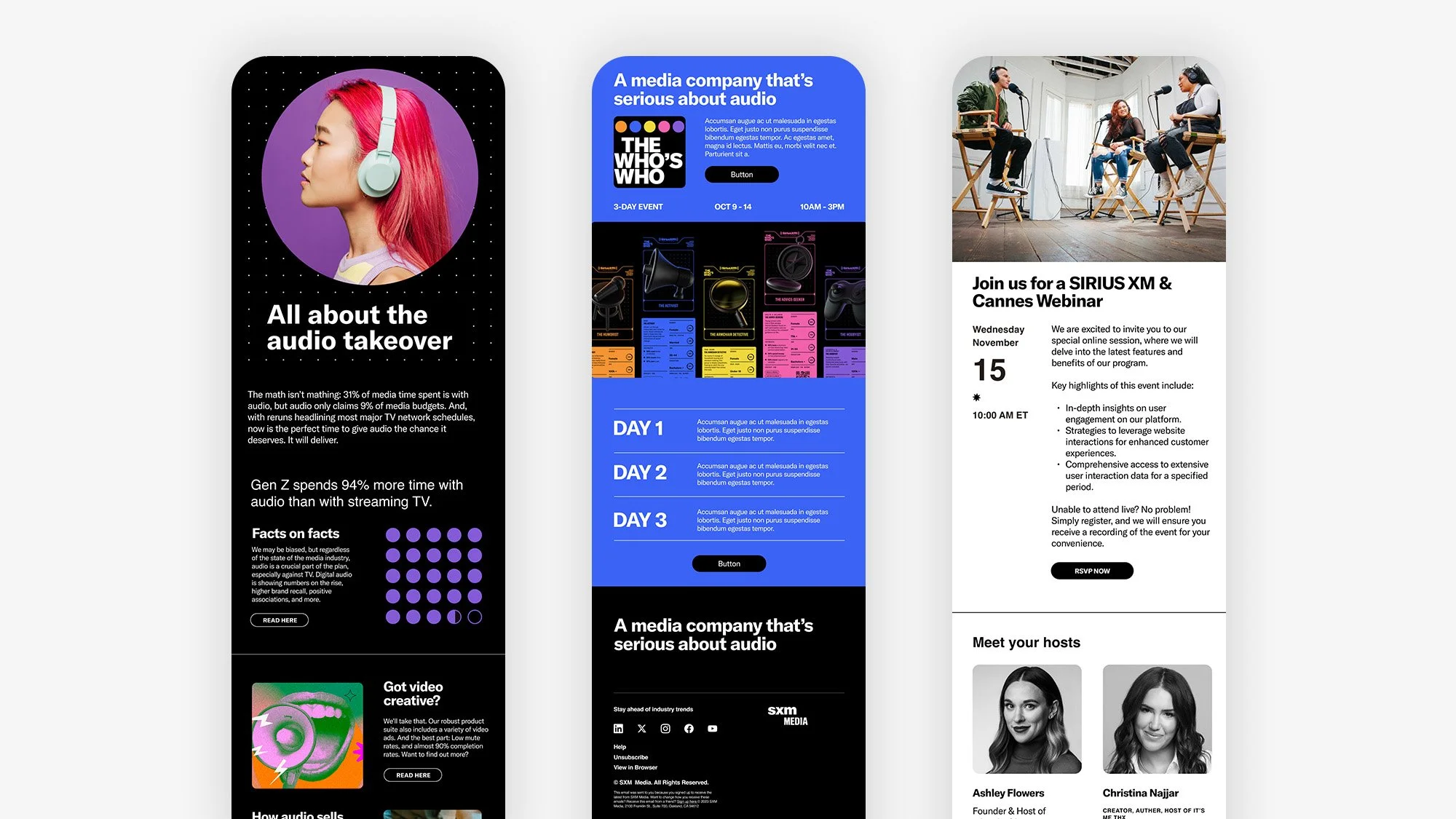 Sirius XM Streaming network offers the finest in streaming music and talk, featuring key platforms such as Pandora, Sirius XM, and SoundCloud. I had the privilege of collaborating with Sirius XM Advertising to revitalize their email marketing and SMS strategies. As the lead designer, I spearheaded the creation and execution of over 40 new email layouts, in addition to developing user-friendly, editable HTML templates.